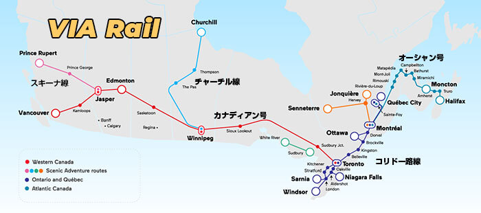 4泊5日かけて西のバンクーバーと東のトロント間、総延長約4,467Kmを走るこの大陸横断ルートは、VIA鉄道のメイン・ルートです。中部の平原地帯からロッキー山脈まで、様々に移り変わる景色がお楽しみいただけます。 中でも1泊2日で走るバンクーバー~ジャスパー間は、ロッキー観光との組み合わせにも便利で、車窓からロッキーの壮大な景色が楽しめることから、最も人気の高い区間となっています。運行は週3便です。